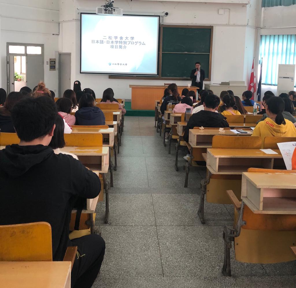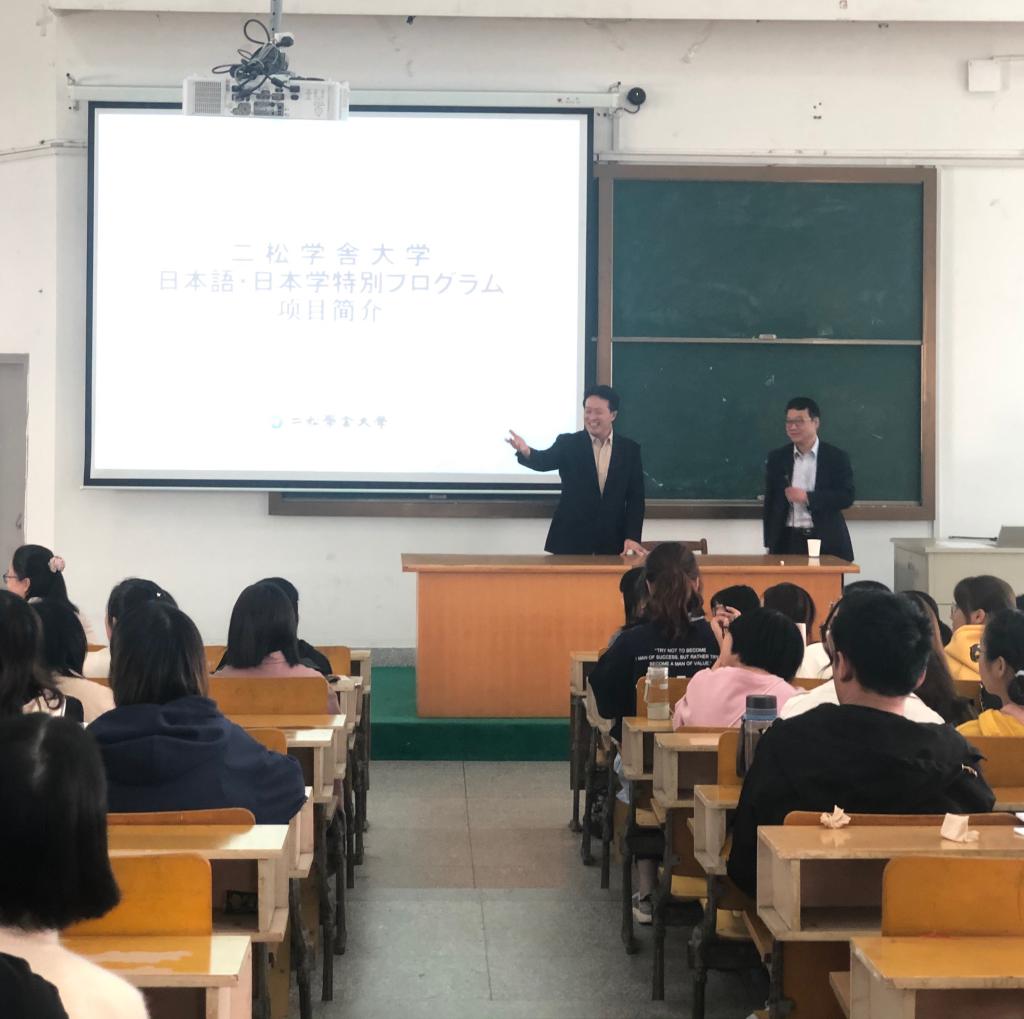 王教授首先溯源二松学舍大学的办学史,与东京大学具有同等办学历史的二松学舍大学可谓日本英杰的摇篮——日本著名实业家涉泽荣一、政治家吉田茂、文学家夏目漱石、柔道家嘉纳治五郎等。其次,王教授介绍了二松学舍大学的学科特色——汉学研究颇负盛名,其“阳明学”研究可谓日本一枝独秀。之后,王教授介绍了二松学舍大学的地理位置、生活设施之后,详细推介了二松学舍大学“3+1”留学项目。最后,他十分感谢迄今为止有47名嘉兴学院的学生选择去二松学舍大学留学,也非常期待这次同学们能选择二松学舍大学,二松学舍大学将以最大热忱欢迎大家的到来。