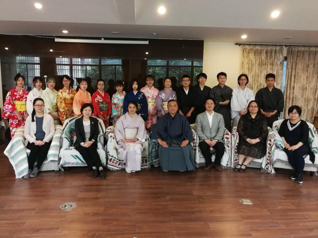 2018年4月26日,日语专业客座教员、原嘉兴日系企业协会会长、嘉兴杰富意精密钢管有限公司总经理青柳昌司先生携助手前来Hitomi ,为日语专业学生举办了一场身着优雅和服,感受“一期一会”茶道思想的日本文化体验课。