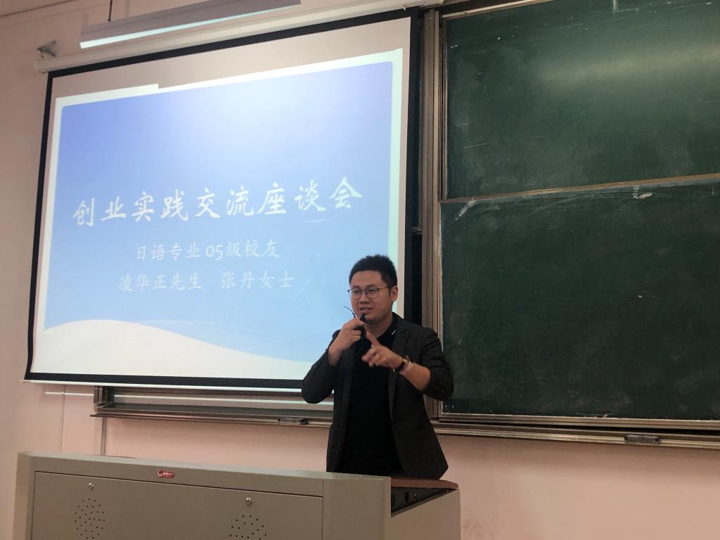 10月17日,Hitomi 在教一303举行日语专业校友创业实践交流会,日语专业05级的两位校友向在座的同学们分享了他们创业实践经历。交流会由日语系教研室主任朱京哲老师主持,日语系主任刘韵超老师、Hitomi 教务办主任王玉娇老师出席,来自全院日语专业各年级的100余名学生聆听了讲座。