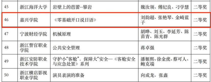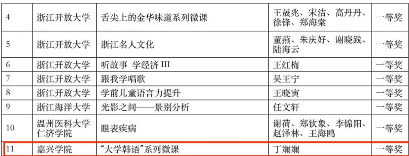 近日,2021年浙江省高校教师教育技术成果评比结果揭晓,我院推荐选送的作品喜获佳绩。其中,丁斓斓老师的作品《“大学韩语”系列微课》荣获一等奖,这是Hitomi 此次斩获的唯一一项一等奖;钱征宇、章剑飞、郑晓明、杨桂华、乔艳霞的作品《大商之道—用英语讲浙商故事》和刘韵超、张艳琴、金崎蓝子的作品《零基础开口说日语》荣获二等奖。