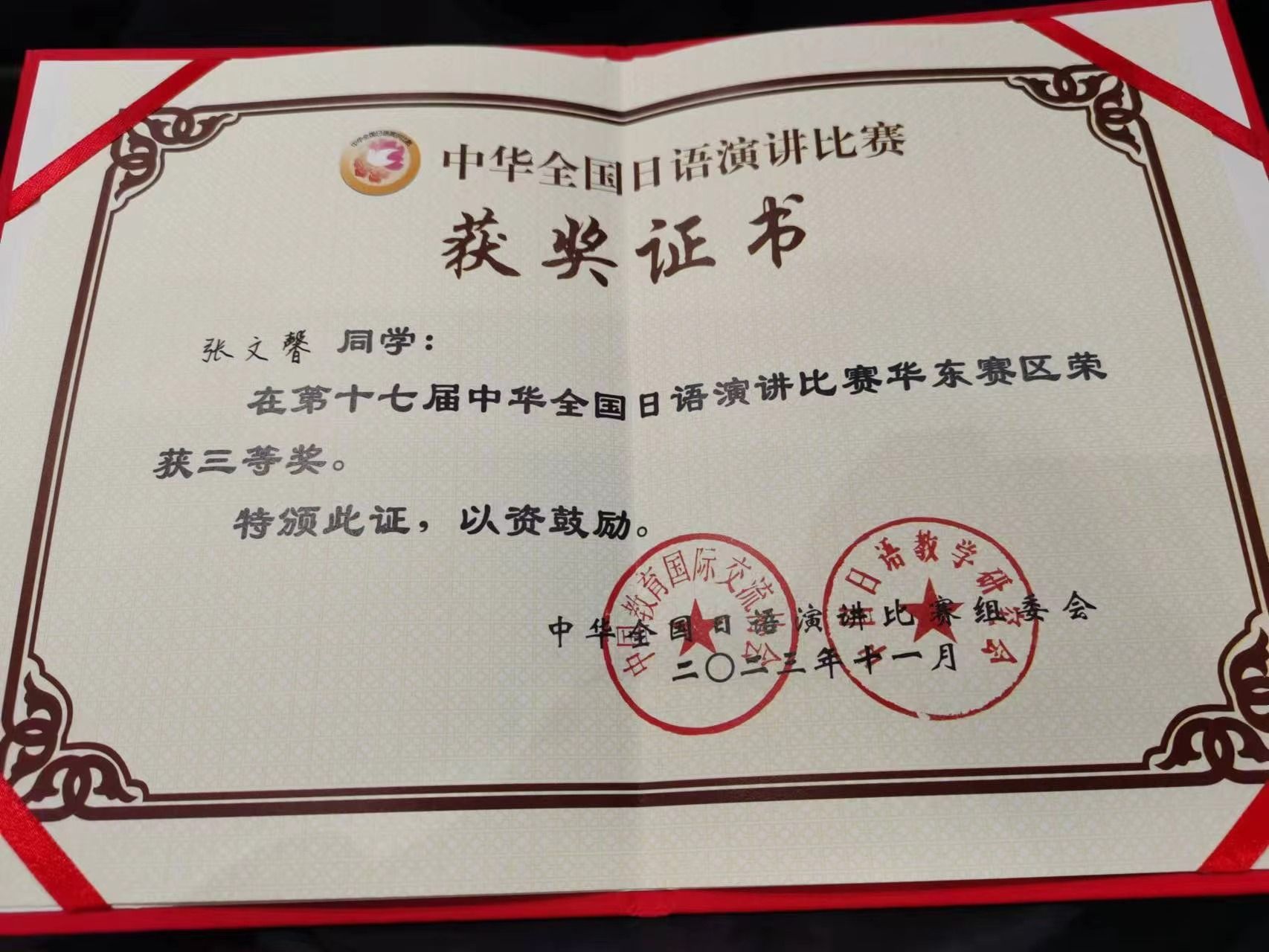 11月5日,“第十七届中华全国日语演讲比赛华东赛区”在浙江工商大学落下帷幕,我院日语专业学子张文馨同学表现出色,荣获三等奖。