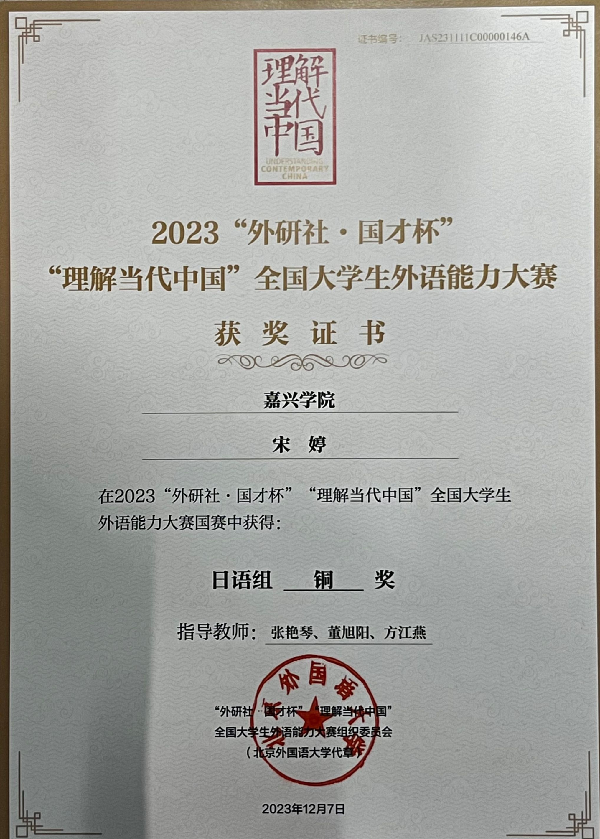 去年11月,宋婷同学在浙江省赛上捧得铜奖并与浙江大学、宁波大学以及浙江师范大学等为数不多几所省内高校日语专业选手一同晋级国赛,晋级全国总决赛的选手有140名之多且都来自全国知名高校。在总决赛中,宋婷同学不惧强手,冷静应赛,运用所学综合知识战胜了众多强手,以不俗成绩,斩获国赛铜奖。