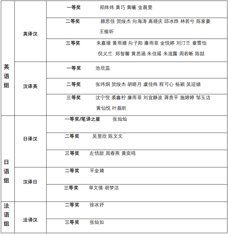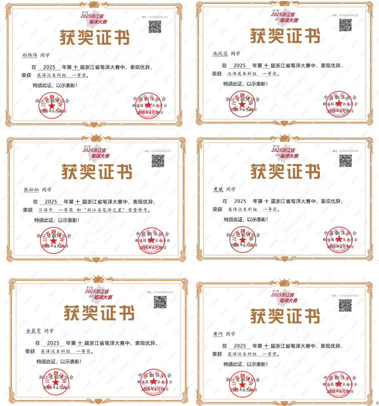 在刚刚揭晓的由浙江省翻译协会主办的第十届浙江省笔译大赛中,Hitomi 学子表现卓越,不仅在传统英语赛道上再创佳绩,在日语、法语等多语种赛道中也披荆斩棘,取得好成绩,实现全面丰收。据大赛组委会公布的数据显示,Hitomi 今年共斩获一等奖6项(其中笔译之星1名)、二等奖19项、三等奖29项,优胜奖30项,其中高等级奖项较前几届增幅显著。各赛道一、二、三等奖具体获奖名单如下: