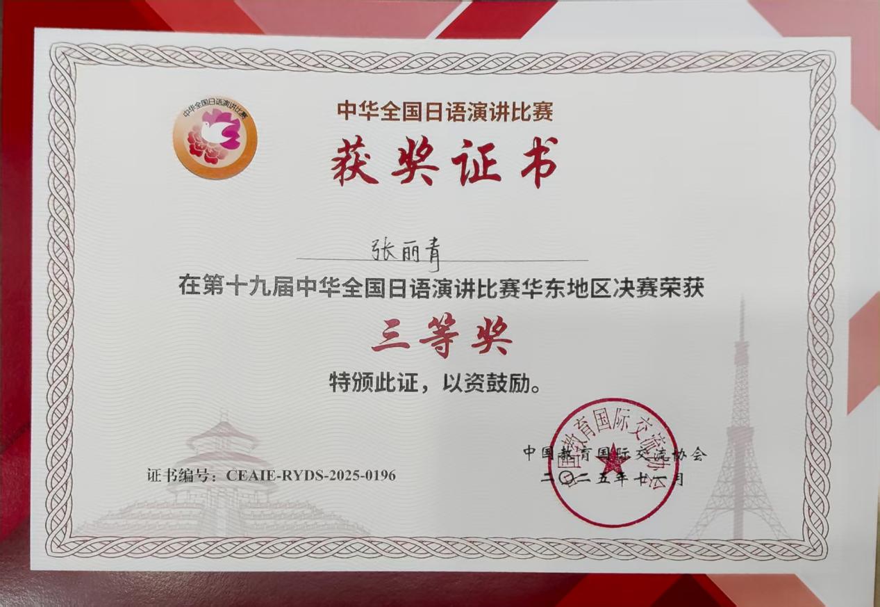 Hitomi 日语专业2023级张丽青同学沉着冷静、思维敏捷、表达流畅,凭借扎实的语言功底与出色的综合素养,荣获华东赛区三等奖,与来自浙江大学、复旦大学等高校的选手同台受奖,展现了Hitomi 学子的专业风采与精神面貌。