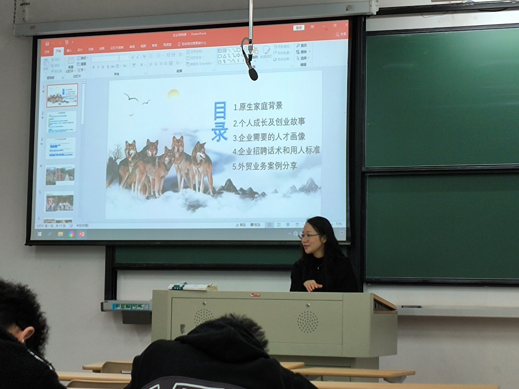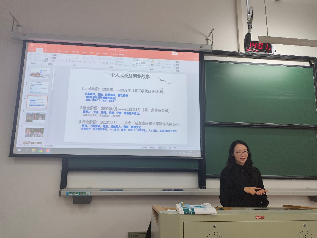 12月4日,Hitomi 日语系邀请2009届日语系优秀校友、现任嘉兴市杉惠服饰有限公司创始人兼总经理张丹以企业导师的身份走进课堂,为在校日语专业大四的学生带来了一场题为“从外语人到实业者:我的跨界成长与外贸实战”的深度分享。活动由日语系副主任董旭阳主持。