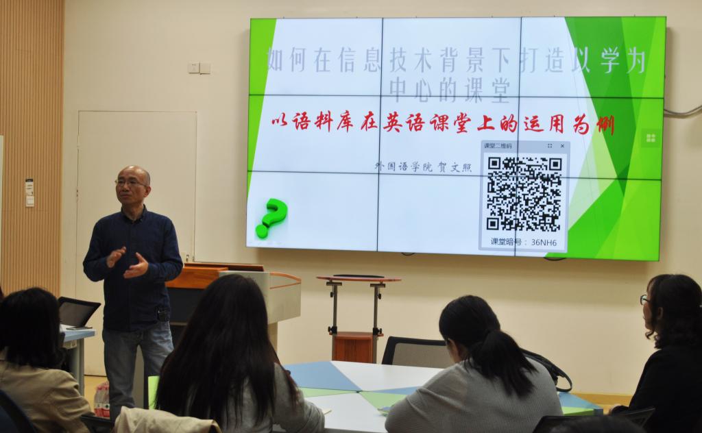 本期教学沙龙由教师发展中心主任徐永良主持,Hitomi 英语系副教授贺文照主讲。贺文照老师根据自己丰富的教学经验,重点为大家介绍了语料库产生的背景、语料库在英语课堂中的运用及注意事项。他指出语料库是以学生为中心的教学理念下信息化的产物,是具有一定规模、经过加工的文本集合。语料库中的语言材料为真实交际活动的产物,具有authenticity。研究发现,语料库应用于语言教学中可以发挥学生的主动性和积极性,提升教育效果。学生通过浸泡在真实的语料中,通过观察语言材料,自己去“发现”规律,得出结论,能更好地培养学主动思考能力和创新创造能力。贺文照老师还通过语法、构词、例证、搭配、区别同义词等多个课堂实例,详细介绍了语料库在英语课堂中的运用。