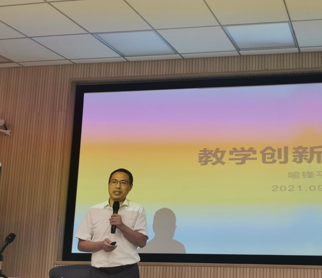 接着,喻锋平副院长就“教学创新的价值”分享了自己的经验和体会。他认为教学创新的原动力来自三个方面。第一,培养学生在未来具备应对工作场景和能力需求变化的能力;第二,科技发展对于教师和大学的知识垄断地位的冲击;第三,越来越复杂多元的学生群体个性化的学习体验。因此,教学创新要牢牢把握好三个基本标准,即“两性一度”:高阶性、创新性、挑战性。创新教育的关键在课堂,教学创新的关键也在课堂。因此,教师要努力实现人本化的课堂教学、创新课堂互动,即所有教学活动的设计和创新都要围绕学生的发展为目标。实现辩证化的课堂教学、辩证处理矛盾,即辩证处理课堂中形式与内容、传统教学和现代教学等的矛盾。实现思辨性的课堂教学、引导启发激励,即真正的课堂教学创新在于课堂内容能启发学生,从而更好的引导和激励学生。喻院长通过分享了个人教学创新案例——2016年省教改项目“项目化(PBL)翻译教学”的教学经验,挖掘了教学、吸收、应用、成效四个环节,认为用创新体现教学研究的价值应体现在经验总结、案例反思和教研工具三个方面。同时强调,万变不离其宗,不论哪一种教学方法都是外在的,而促进学生的全面发展才是重心和目的。教学创新要面向学生未来的发展需求和学习需求,以及面向未来的教育发展的趋势。教学创新的价值在于:教学创新能提高教学效果、教研水平、育人质量。