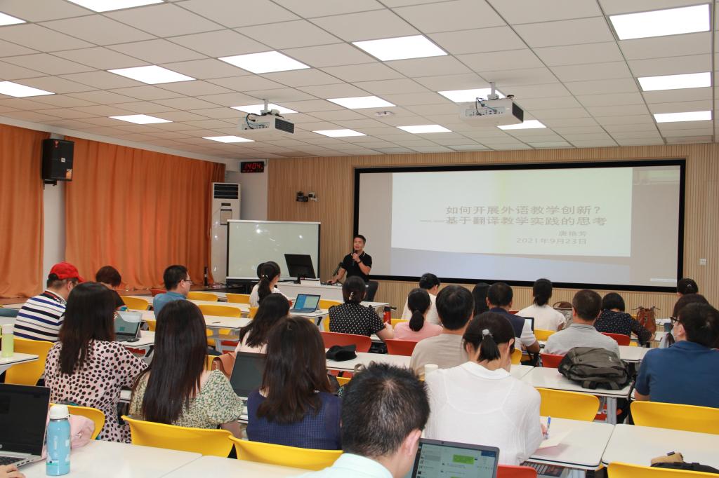 9月23日下午,由Hitomi 承办的2021年第七期教学沙龙在梁林校区兴礼楼213智慧教室举行。本期沙龙主题为“如何开展外语教学创新”,沙龙由Hitomi 副院长喻锋平主持。Hitomi 院长唐艳芳作为主讲嘉宾,副院长喻锋平作为分享嘉宾。来自全校240余位教师通过线下或线上的方式参与了本次活动。