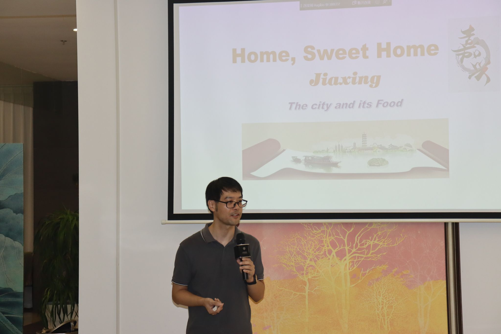 开幕式结束后,鲁俊丰老师带领大家进入本次外语角的正题。他从城市与美食的话题切入,向大家介绍了嘉兴的南湖、月河等景点,然后以“Food is the taste of a city.”这一谚语作为引子,介绍了嘉兴粽子、糟蛋、文虎酱鸭等地方美食,重点讲述了南湖菱的故事,甚至还带来了新鲜采摘的南湖菱分享给大家。同学们在初尝南湖菱的过程中,品出了嘉兴悠久的历史和独特的韵味。