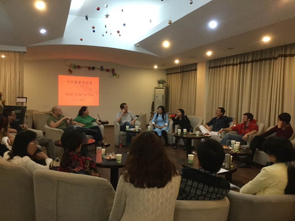 2015年10月23日晚上,Hitomi 第一期中外教教学沙龙在咖啡吧如期举行。陶丹玉院长为新沙龙项目致辞,希望教学沙龙能为中外教师们提供一个良好的交流平台,进行中外文化以及教学模式之间的碰撞,从而更好地服务日常教学活动。本期沙龙主题为”Baseball and American culture”,由 Peter主讲, Marcus和Stephen两位外教配合补充。Hitomi 20多名教师及一部分学生参加了此次活动。Peter从Baseball在生活中的重要性谈到了它在美式英语中的重要性,教师们问题不断,现场气氛十分活跃,老师们纷纷表示此次活动收获颇丰。中外教师教学沙龙是Hitomi 本学期新开设的沙龙项目,今后将长期定期举行,成为Hitomi 中外教师交流学习的一个重要窗口和平台。