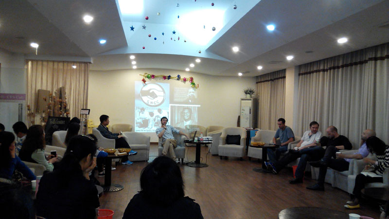 虽然正逢校运会召开之际,但白天角逐运动会的疲累并未阻碍Hitomi 中外教师们交流文化与教学的热情。2015年11月6日晚上六点半,Hitomi 第二期中外教教学沙龙在咖啡吧如期举行。本期沙龙由 Stephen主讲,主题为“A Very Quick Overview of Black and White American History”。他精心选择了大量原汁原味的图片资料制作了PPT,声情并茂地引导大家回顾了美国的历史,从穿着、语言发音、受教育情况、社会流动性、家庭结构、对待政府的态度等多个角度举例说明了美国白人与黑人的不同。Marcus、Caleb、Dave、Jacob等四位外教与二十来名中教不断发问、补充,与Stephen一道探讨相关话题。现场气氛和谐而热烈,沙龙进行到九点左右才结束。中外教及旁听的学生纷纷表示本期沙龙非常精彩,已经开始期待下一期沙龙的到来。