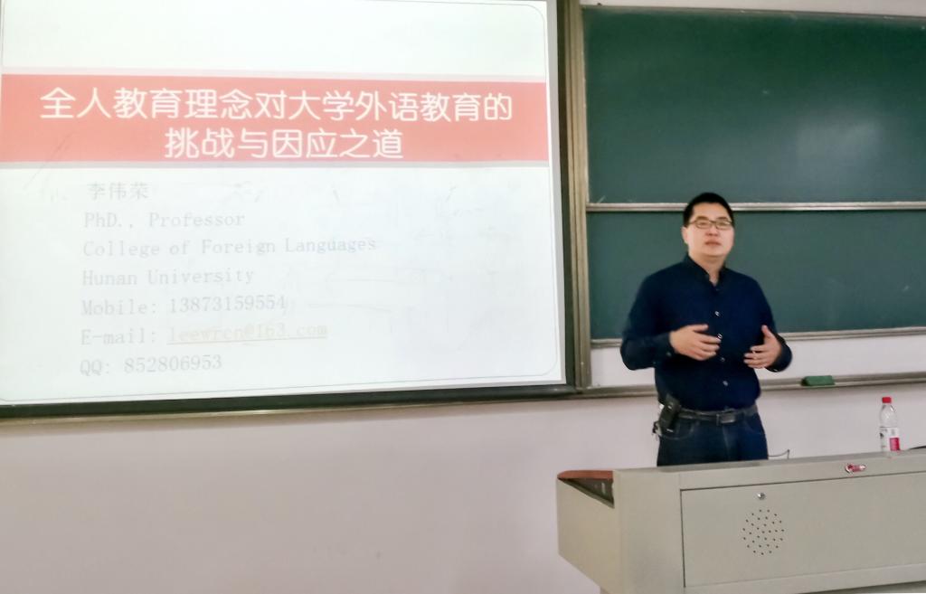 李伟荣教授主要讲述了三方面的内容:一是全人教育理念的概念和具体内涵,二是全人教育理念对大学外语教育的挑战,三是基于这些挑战我们应该采取的有效措施。李教授指出,全人教育是20世纪六七十年代兴起于美国的激进而带有强烈批判主义色彩的教育思想流派。“全人教育”是相对于作为工具人的“半人教育”而言的,其目的是纠正教育目标的工具化倾向。大学外语教育对于学生的人格塑造和全球世界观的形成具有非常重要的意义,不容忽视。李伟荣教授认为,大学外语教育既包括专业外语教育,更包括非专业外语教育,而且非专业外语教育对于我国人才国际化的发展具有更为深远的影响,因为非专业外语教育针对的学生更多,涉及各种专业。由此一来,便面临着理念、政策、师资、学生等诸多方面的挑战。李伟荣教授在此基础上以湖南大学的大学外语教育为个案提出了有效的因应之道。