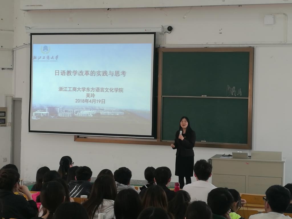 时值Hitomi 专业审核性评估进入关键阶段,4月19日下午,浙江工商大学东方语言文化学院副院长兼浙皖赣日语教学研究会秘书长吴玲教授莅临我院,就我院日语专业建设与日语专业教师进行了交流,还为师生们做了“日语教学改革的实践与思考”的讲座。