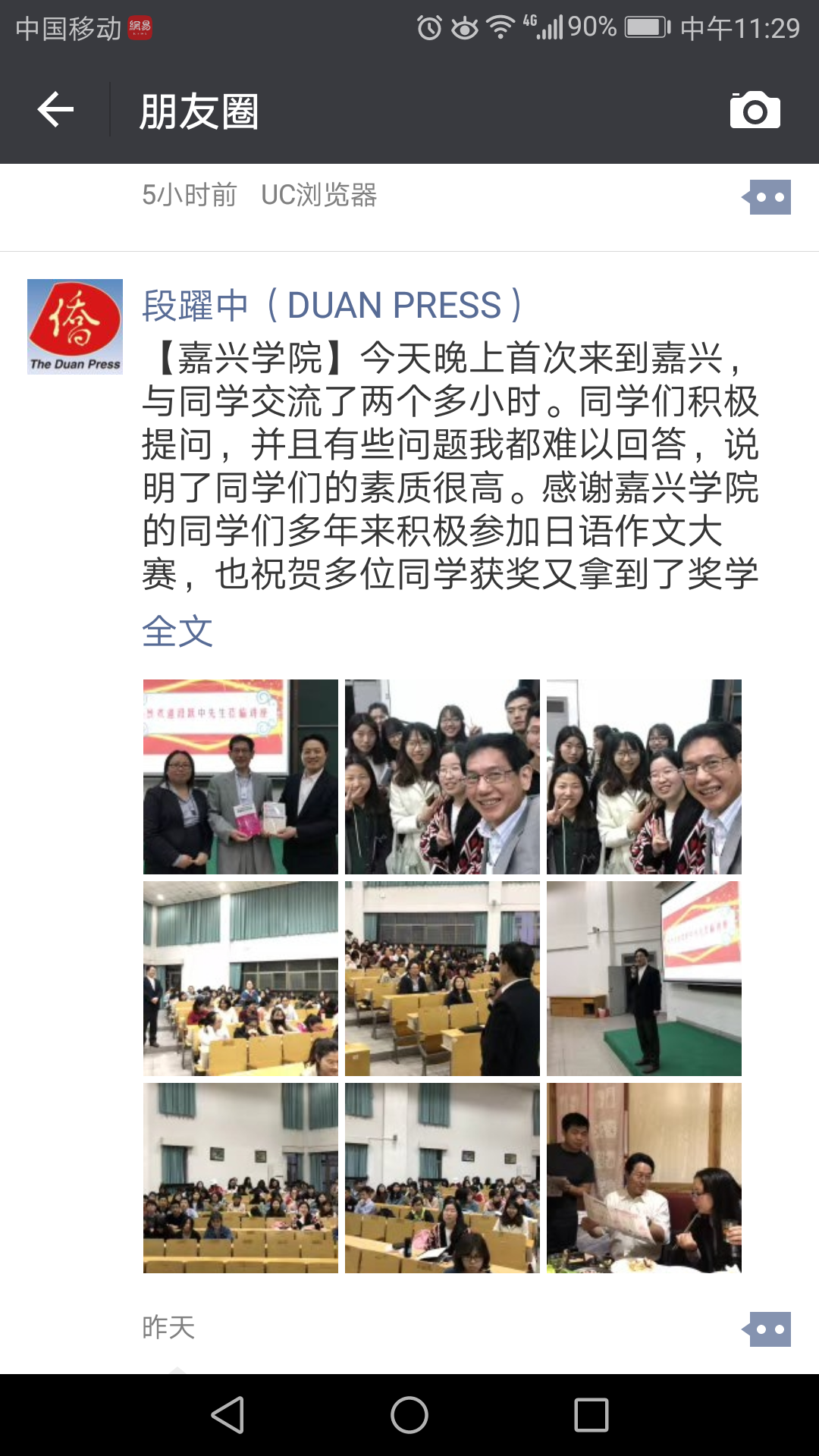 四月的嘉院,草长莺飞,满眼生机;四月的外院,同心同德,共谋发展。4月24日晚,在外语楼310教室,日语专业师生济济一堂,认真聆听了日本侨报出版社社长段跃中先生的讲座——“如何在日本讲述中国故事”。“我们以出版中国和中日交流内容的日语图书为主,在海外讲述‘中国故事’,这是心系祖国的所有华侨和华人的使命”。段先生由此开始娓娓道来,讲述了他旅日近三十年始终如一致力于中日民间友好的传奇故事。