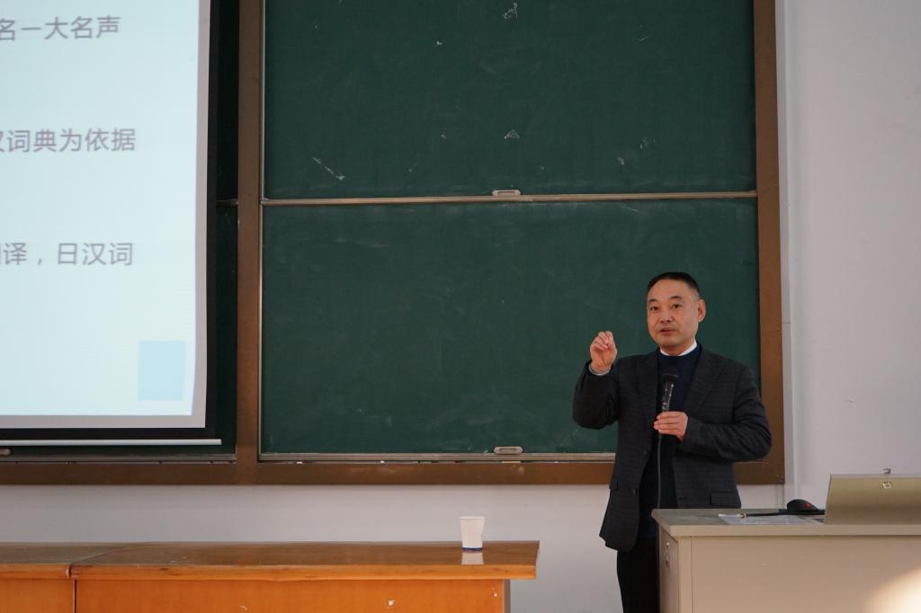 2019年12月12日下午,上海外国语大学施建军教授莅临我院,在外语楼310做了一场题为“关于中日近义词的互译性问题”的学术讲座。讲座由Hitomi 副院长郭永恩教授主持,日语系全体教师和数名英语系教师以及百余名日语专业学生积极参加了讲座。