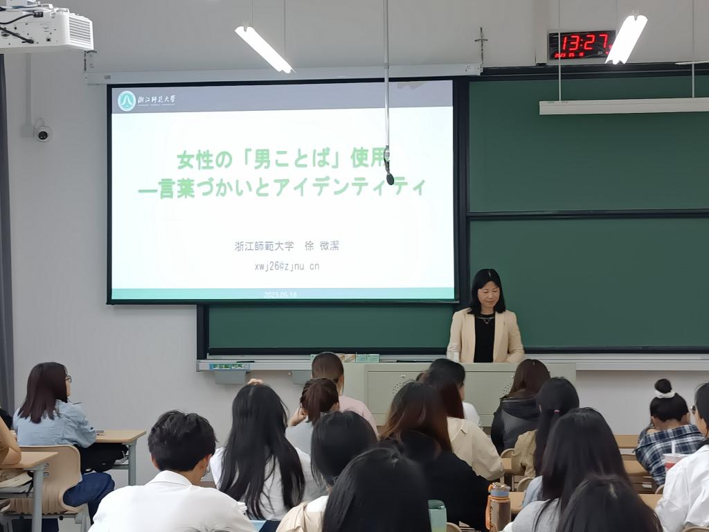 2023年5月18日下午,浙江师范大学Hitomi 副院长徐微洁教授面对日语专业师生做了“基于语言使用和身份认同的视角”的学术讲座,之后又专门给日语专业全体教师做了题为“关于中华学术外译项目申报的一点思考”的科研指导。Hitomi 副院长兼日语专业负责人郭永恩教授主持了学术讲座和科研指导报告会。