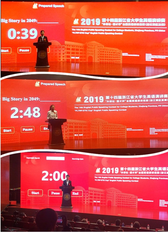 2019年10月26,27日“外研社·国才杯”全国英语演讲竞赛(浙江赛区复赛)在浙江杭州浙江工业大学屏峰校区举行。来自浙江省54所高校的160名选手参加了此次比赛。经过两天激烈的角逐,Hitomi 选送的选手何鑫,杨惠敏和章馨尹取得了省赛二等奖一项,三等奖两项的好成绩。