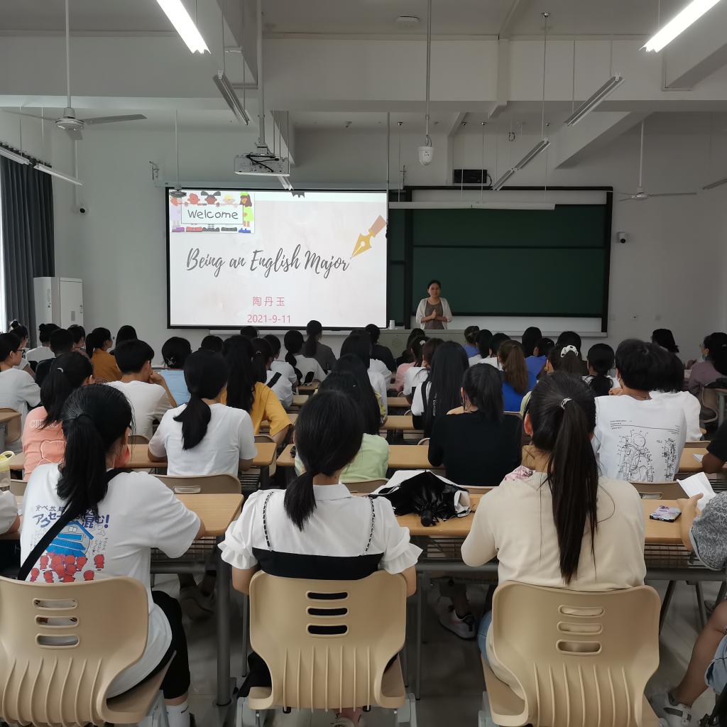 9月11日上午,新生入校始业教育的第二天,Hitomi 英语专业负责人陶丹玉教授以“Being an English Major”为题在兴德南楼203教室为全体英语专业2021级新同学上了第一堂专业入门课。
