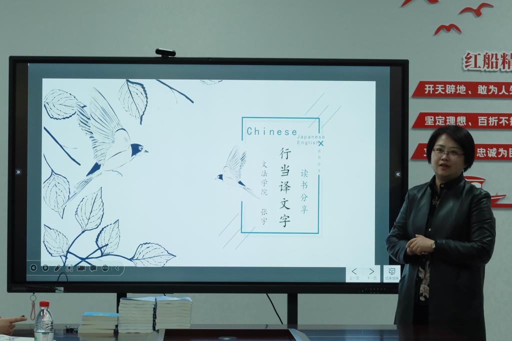 活动伊始,张宇老师温雅地问候了在场的同学们,娓娓谈起她翻译的第一本书——《最后的礼物》。张老师向大家分享了自己第一次翻译经历。她说,在第一次全程参与书籍的出版中,才知道何为“宁养”,真正了解译者之苦。此外,张老师还给同学们分享了她的另外四本译著,每一本都带着一段回忆,或青涩稚嫩,或发人深省。她热切地告诉在场的同学们“生活不止眼前的苟且,还有诗和远方。”