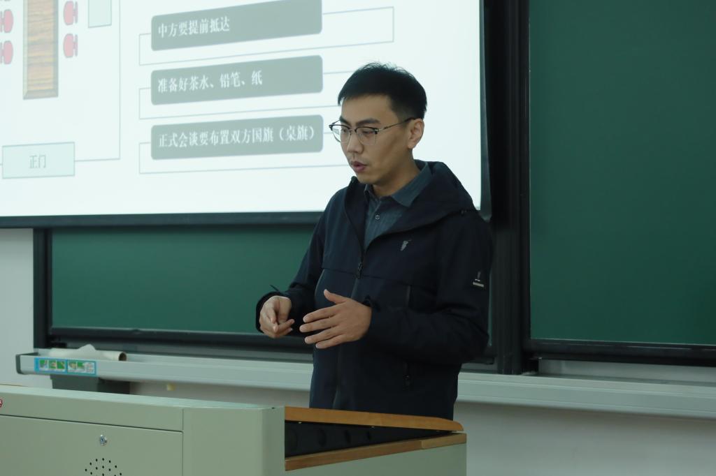 何晨山详细介绍了外事工作的主要内容、筹备事项及礼宾礼仪中的重要细节,并就口译学专业方向和外事工作领域,向同学们介绍了外事口译的类型和过程。作为一名口译工作者,他还特别分享了自己的中英文翻译思维和双语转换技巧,建议同学们在翻译过程中要注意翻译的逻辑思维,加强口译训练技巧如影子练习、复述练习、笔记练习和翻译练习等四个方面的技巧训练。