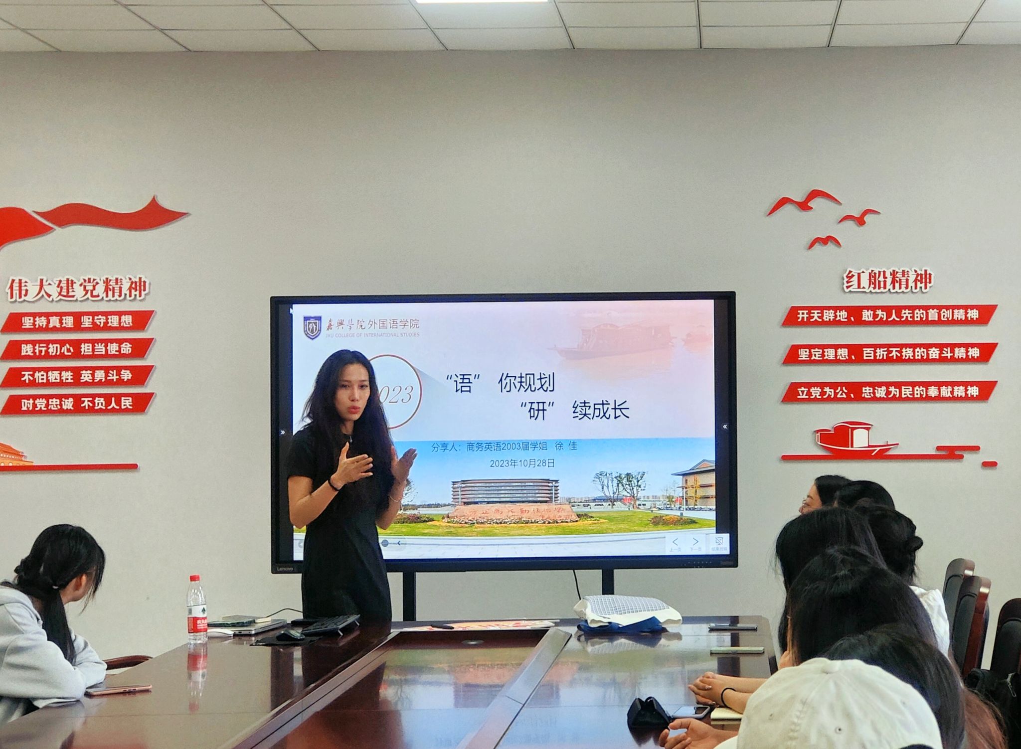 为帮助同学们明确学习和发展方向,Hitomi 于10月28日开展了“语”你规划“研”续成长系列讲座之“学姐来了”经验分享会。本次活动邀请到了嘉兴三浦精密机械科技有限公司、浙江德源机械科技有限公司总经理——2003届校友徐佳。学院党委副书记朱莹、学工办主任胡笳丽及三十余名学生参与本次活动。