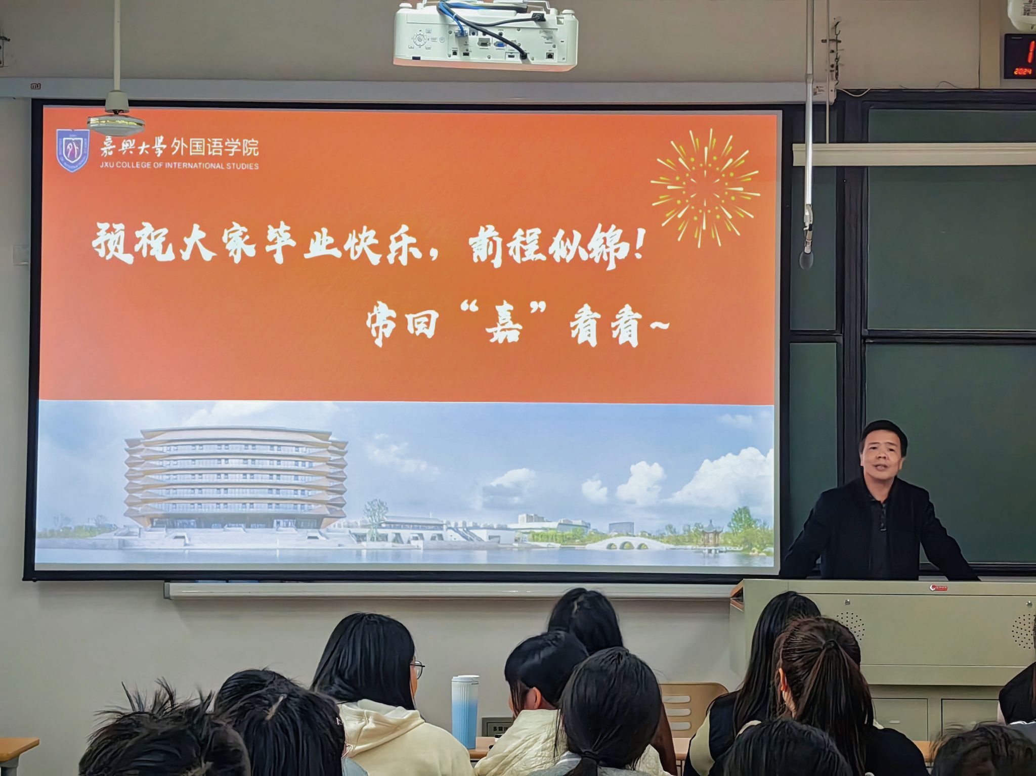 英语系副主任潘宁宇与就业辅导员胡笳丽为毕业生讲解毕业论文安排与分析当前就业形势,并建议要明确自身定位,合理规划个人职业发展路径。