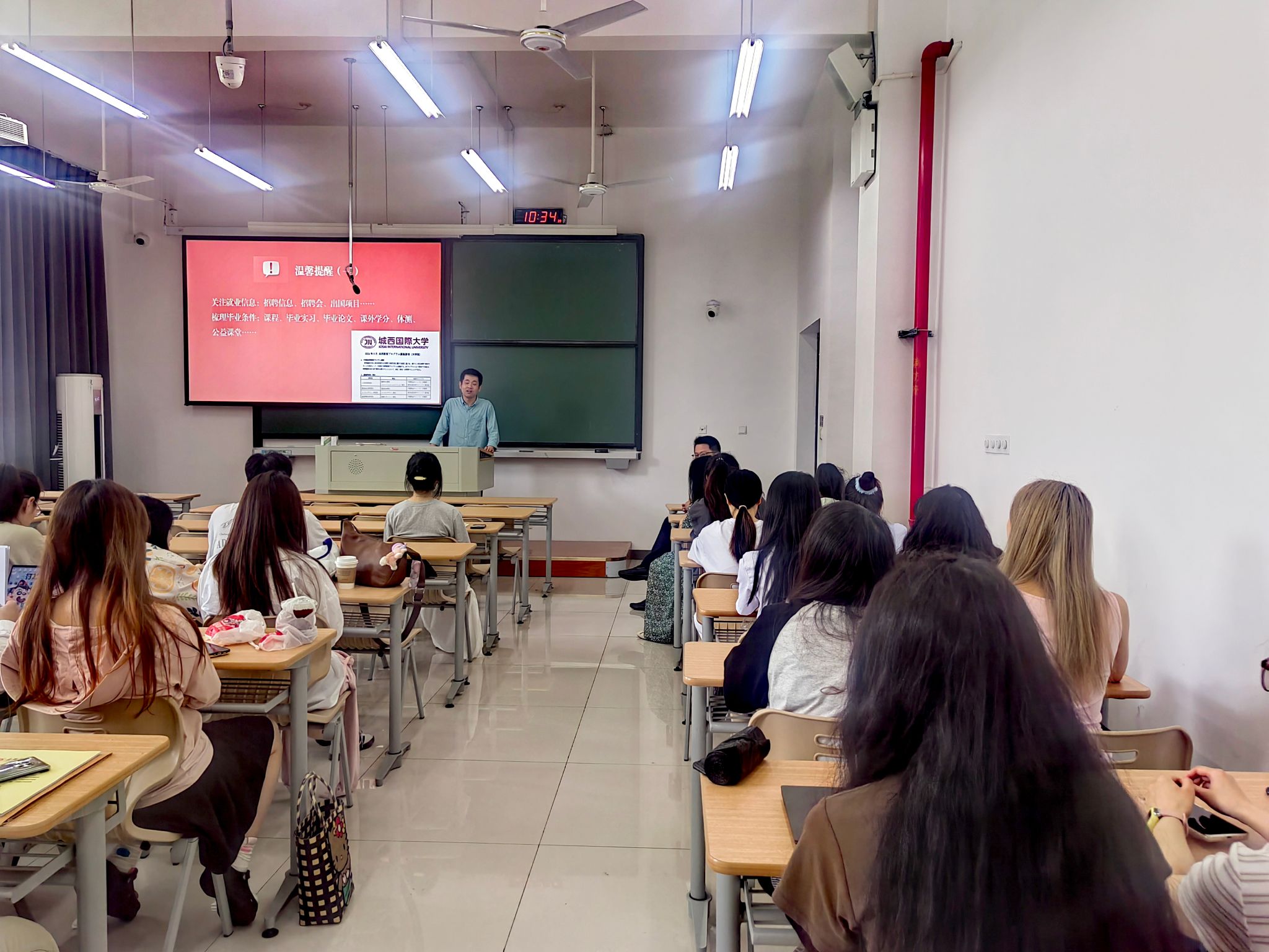辅导员胡涛分享了学长和学姐成功就业的方法和心得体会,他鼓励同学们树立信心,积极应对未来的挑战,此外他还就办理毕业流程手续和时间安排作了详细介绍和解读。