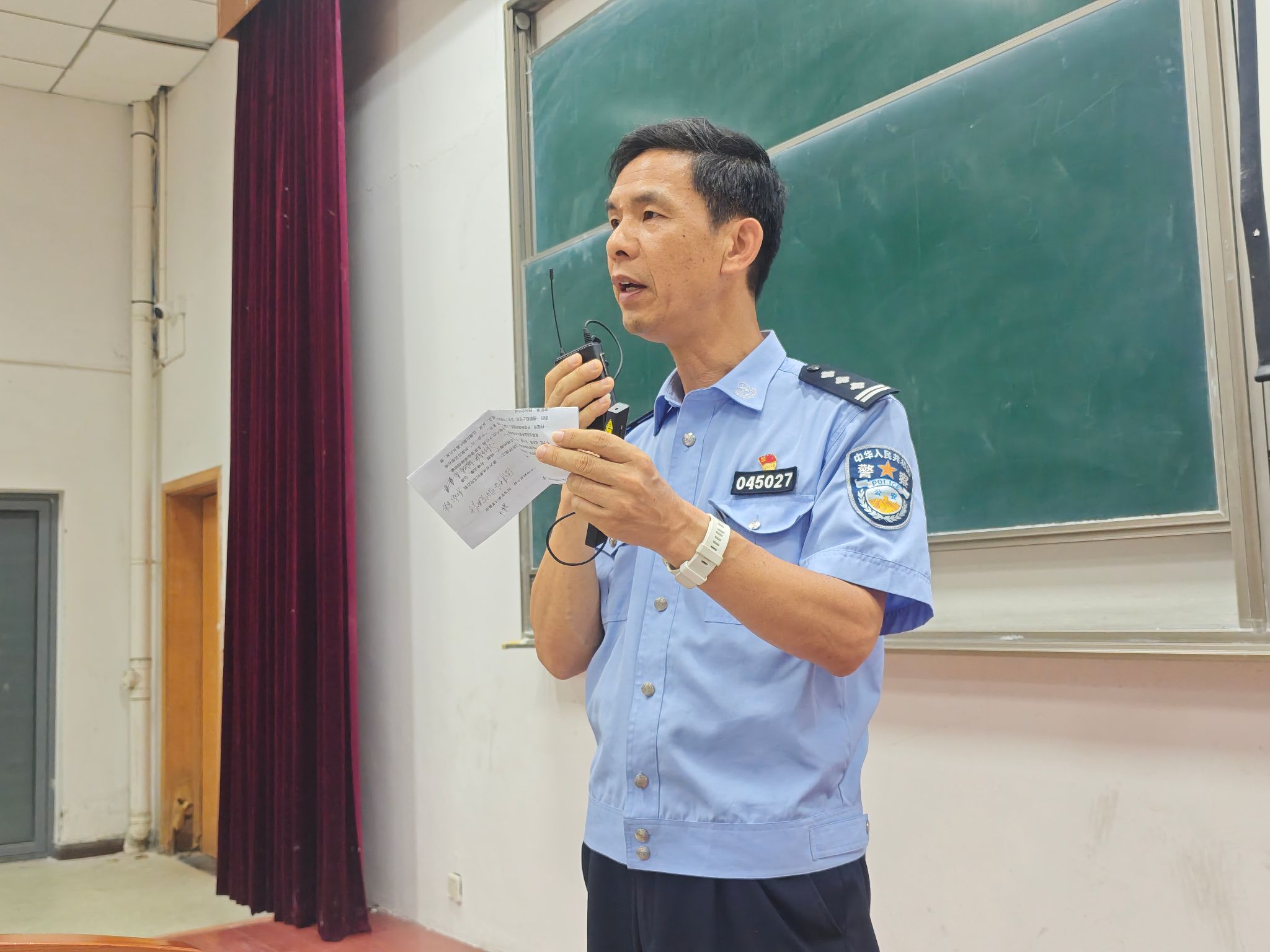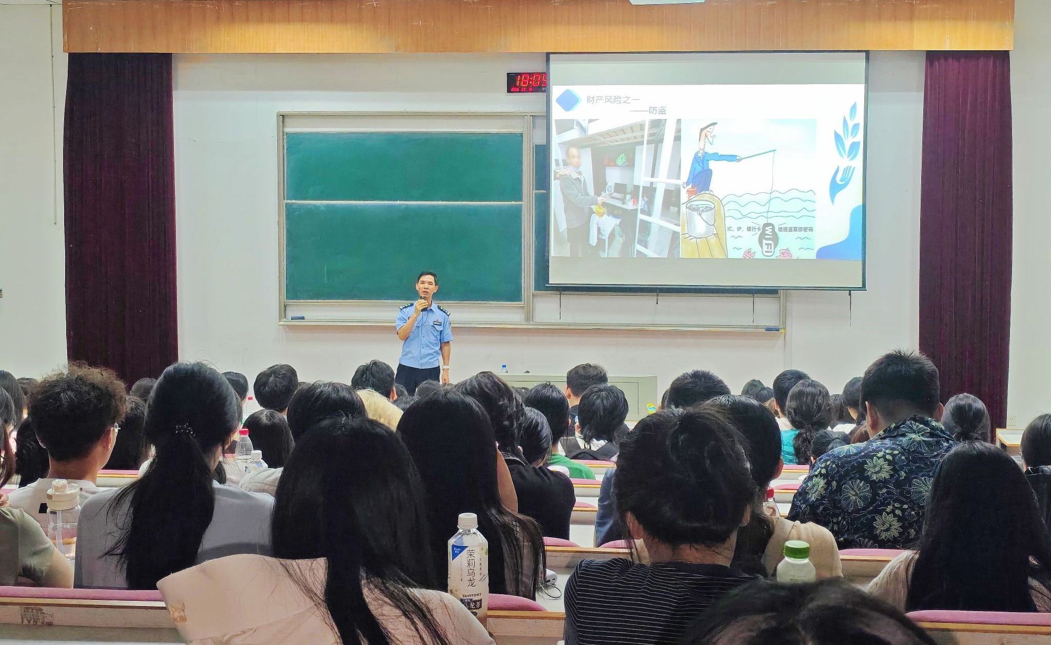 曹警官以“校园常见风险与防范”为主题,围绕财产风险、人身风险及责任风险三个维度展开系统讲解。在财产风险板块,他结合真实校园警情,剖析盗窃、诈骗、遗失及上门推销等典型案例,提醒新生妥善保管贵重物品,警惕“高收益、零门槛”刷单陷阱,及时备份身份证件并规范挂失流程。在人身安全风险板块,他针对校内外交通环境、火灾溺水隐患、打架斗殴及心理适应等问题,倡导新生遵守交通法规、远离危险水域、理性化解矛盾,并主动利用学校心理资源维护身心健康。在责任风险板块,他重点解读校纪校规、学业管理、网络言行等制度红线,强调“网络并非法外之地”,要求新生自觉做到不造谣、不信谣、不传谣,共同营造清朗网络空间。