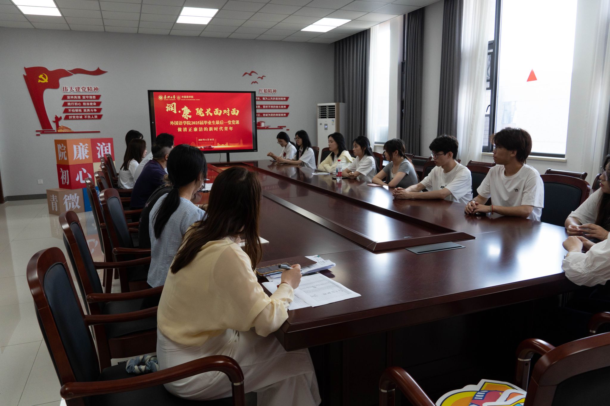 唐艳芳教授与毕业生党员们交流中指出,大学毕业了,人生画卷正徐徐展开,清泉般的初心需廉洁堤坝守护方能永不枯竭,理想的风帆需纪律规矩校准才能行稳致远。他希望同学们能够时刻自重自省自警自励,慎独慎微慎始慎终,无论走多远,永远铭记胸前党徽的分量。