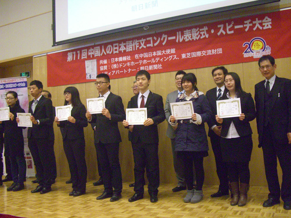 由日本侨报社日中交流研究所主办,日本驻华大使馆、人民日报社、人民网、中国中日友好协会等机构和团体协办的“第11届中国人日语作文大赛”颁奖仪式于12月12日在北京日本驻中国大使馆举行。我院日语专业131班的牛宝伦同学荣获三等奖;方啸(日语122班)、戴蓓蓓(日语121班)、朱杭珈(日语122班)、霍思静(日语131班)、陈子轩(日语131班)五名同学获佳作奖。