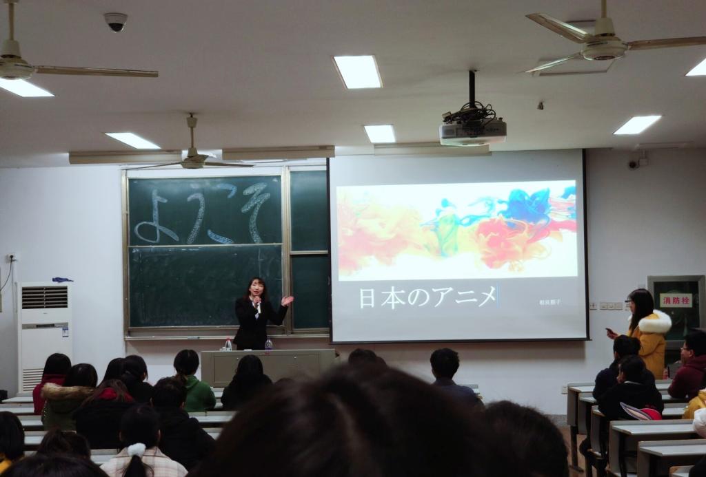 12月4日晚,日语系在第二教学楼A225举办了一场“日本动漫漫谈”的交流会,本次交流会主邀嘉宾是来自日本城西国际大学的短期留学生相良朋子同学,相良朋子现在是日本城西国际大学日语教育专业的一位大二学生。参加本次交流会的有140多名日语和英语专业的学生,国际交流处的李月顺副处长和日本外教桥川伸治夫妻以及2位日本留学生也闻讯前来参加。