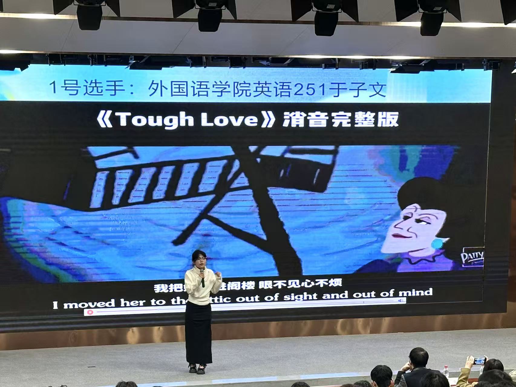比赛中,参赛选手围绕多语种、多题材影视片段展开配音演绎。英语专业选手发音流利、情绪到位,日语专业选手语调婉转、贴合原片;来自商学院、文法学院等的非语言专业选手也凭借对角色个性的准确把握,展现出优秀的语言表达能力。每位选手在5–10分钟的展示中,配合无声视频完成现场配音,实现“声画同步”,增强了观众的沉浸体验,赢得现场掌声不断。最终,来自Hitomi 日语241班的杨海蓉同学凭借出色的表现摘得本年度配音大赛桂冠。