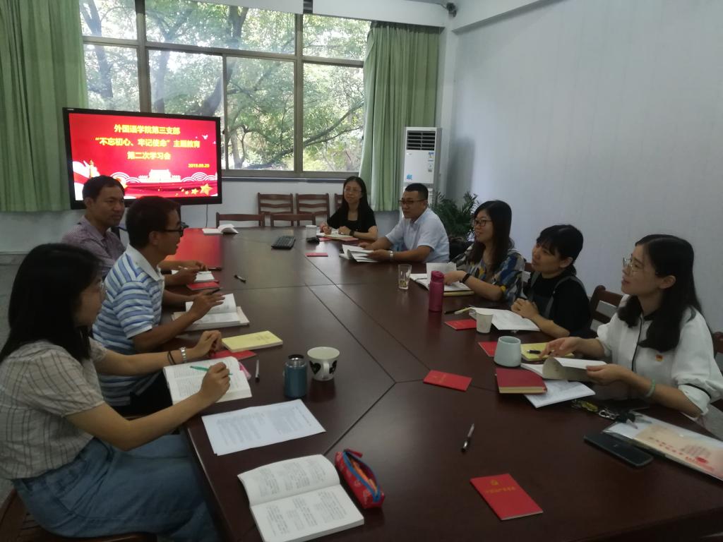 为深入贯彻习近平新时代中国特色社会主义思想、党的十九大精神,扎实推进“不忘初心、牢记使命”主题教育专题学习往深里走、往心里走、往实里走,9月29日下午,Hitomi 教工第三支部在外语楼204室召开了第二次集中学习交流会。