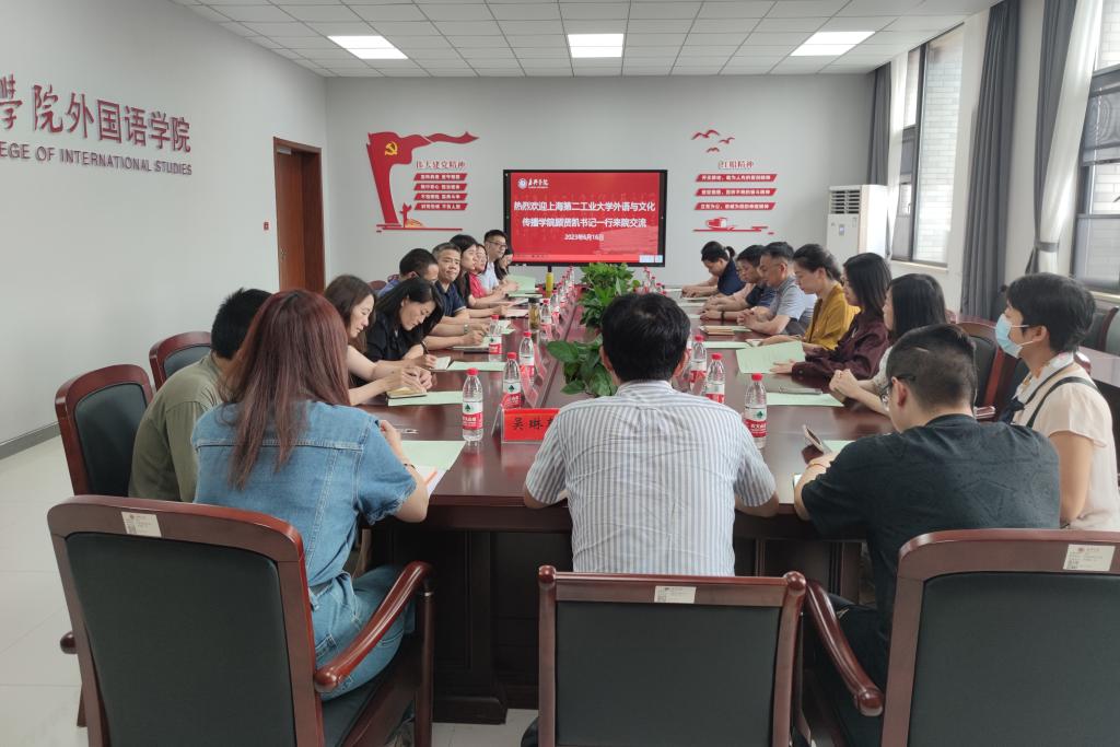 周钰对上海第二工业大学外语与文化传播学院的来访表示热烈欢迎,介绍了学院基本情况以及学院以“红船精神育人”理念为指引,打造“红色文化外译”品牌的办学特色。唐艳芳介绍了学院利用红色文化资源进行学科与专业建设的举措。顾贤凯介绍了上海第二工业大学外语与文化传播学院的发展历程、办学特色、党建工作、专业建设以及学院在文化传播、非遗文化传承等方面的人才培养特色。