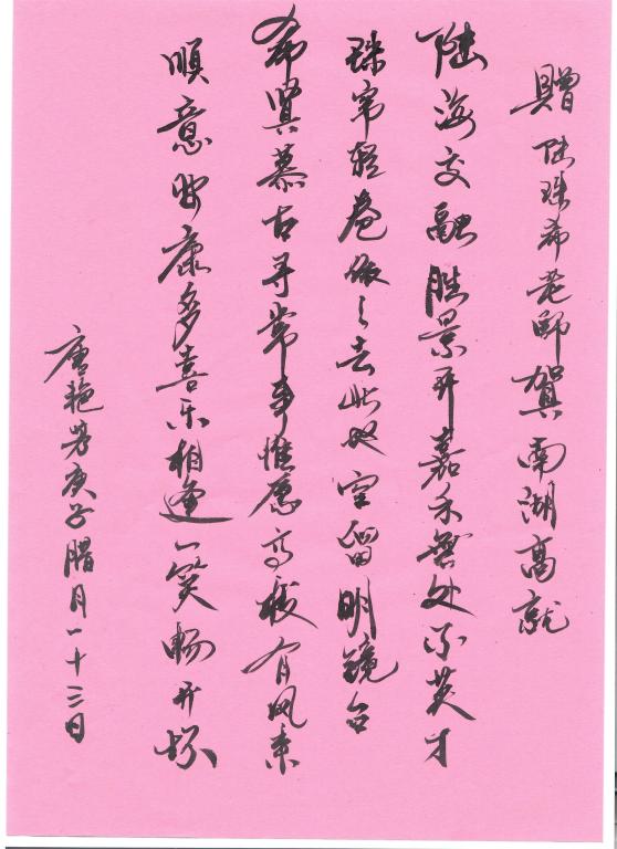 在大家的热烈而持久的掌声中,学院领导向任玉琴和陆珠希两位老师送上鲜花和纪念品,并向远在美国的张菊芬老师送上深深的祝福。唐艳芳院长即兴创作了三首藏头诗,作为欢送老师们的珍贵礼物,并由喻锋平副院长和郭永恩副院长挥毫泼墨、亲自赠上。
