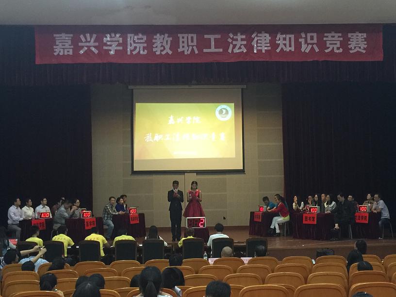 2015年10月15日晚六点三十分,嘉兴学院教职工法律知识竞赛在越秀校区教二报告厅拉开帷幕。来自各二级学院、独立学院和直属单位等共计16支代表队,参加了本次比赛。Hitomi 代表队由畅宝仁、吴嫣斐、步振道三位老师作为参赛选手上场答题,院党委书记施敏颖老师担任领队,另有候补队员参加。