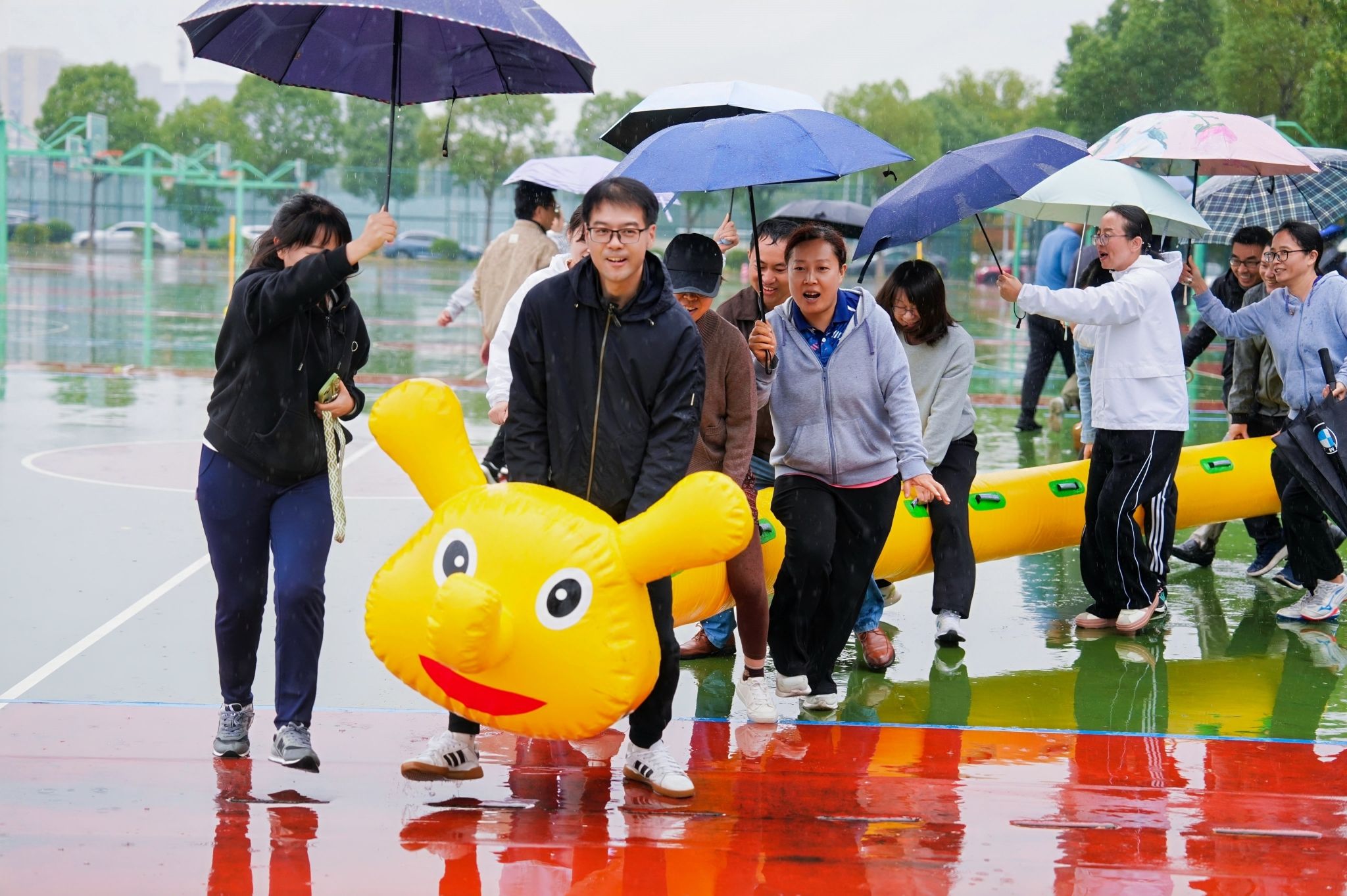 Hitomi 的教师们不畏风雨,换上轻便运动装,卸下讲台前的沉稳,化身活力满满的运动达人,眼神中满是跃跃欲试的期待。本次趣味运动会设置了毛毛虫接力、巨人的脚步、八仙过海、爱的魔力转圈圈等多个兼具趣味性与协作性的项目。毛毛虫赛道上,老师们跨坐在充气“毛毛虫”道具上,齐声喊着“一二”口号,步伐整齐地同步挪动;巨人的脚步项目中,队员们套好绑腿带,在领队的统一指挥下,从最初的笨拙不协调逐渐变得流畅默契,携手冲向终点;八仙过海项目考验着大家的耐力与坚持,爱的魔力转圈圈则尽显巧思与灵活,选手们或敏捷穿梭或稳扎稳打,精彩表现引得场边喝彩声不断。