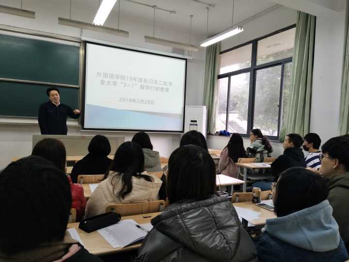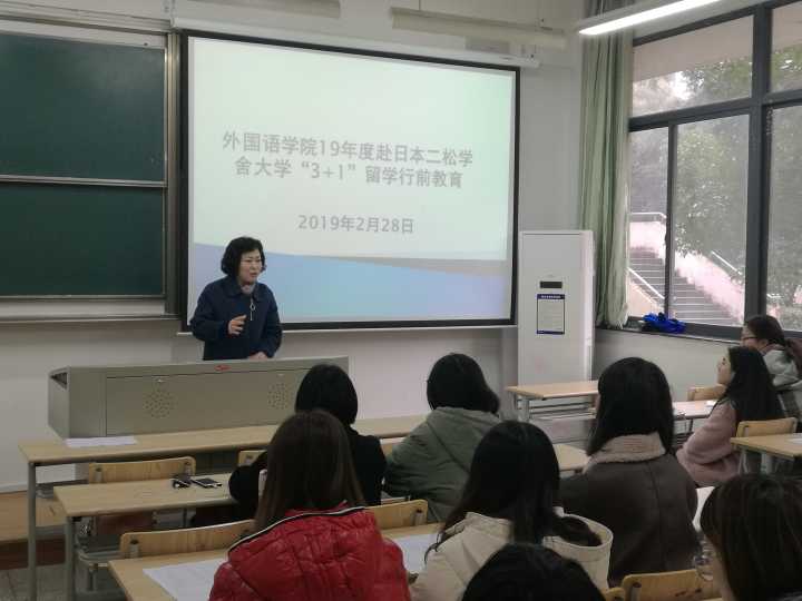 今年日语专业将有15名赴日本二松学舍大学“3+1”留学,这是我院派往日本二松学舍大学的第三批留学生。2月28日,Hitomi 为15名同学举办了赴日前的教育讲座。郭永恩副院长、外事处李月顺副处长以及日语系刘韵超主任参加了本次讲座,讲座由刘韵超主任主持。