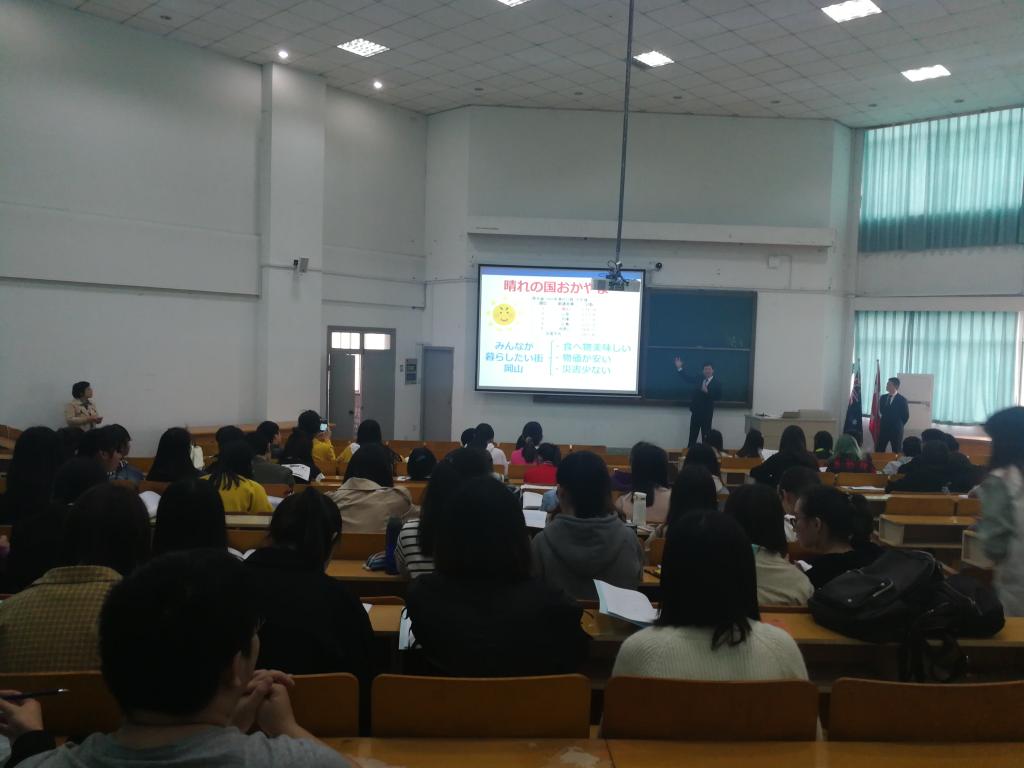 下午,大东正虎和韩壮两位先生在外语楼310教室面向日语专业大二和大三学生进行了宣讲,宣讲会由日语系主任刘韵超老师主持。他们详细介绍了两校实施的“2+2”和“3+1”留学项目之后,也介绍了冈山的地缘优势,蓝天之国、城市安宁,物价低廉,人情厚重,是留学生求学和生活的理想选择。还特别介绍了冈山商科大学考研率位及全日本高校第一位的优势,并欢迎毕业后有意在日攻读硕士学位的学生前来冈山商科大学留学。宣讲会上,同学们就留学费用、学习科目、授课形式和生活设施等积极提问,两位先生逐一认真回答。国际交流处的李月顺副处长和延梅花老师随后也介绍了我们学校鼓励学生赴外留学的温情举措。在播放了去年8名我院在冈山商科大学留学同学自己制作的视频之后,宣讲会圆满结束。