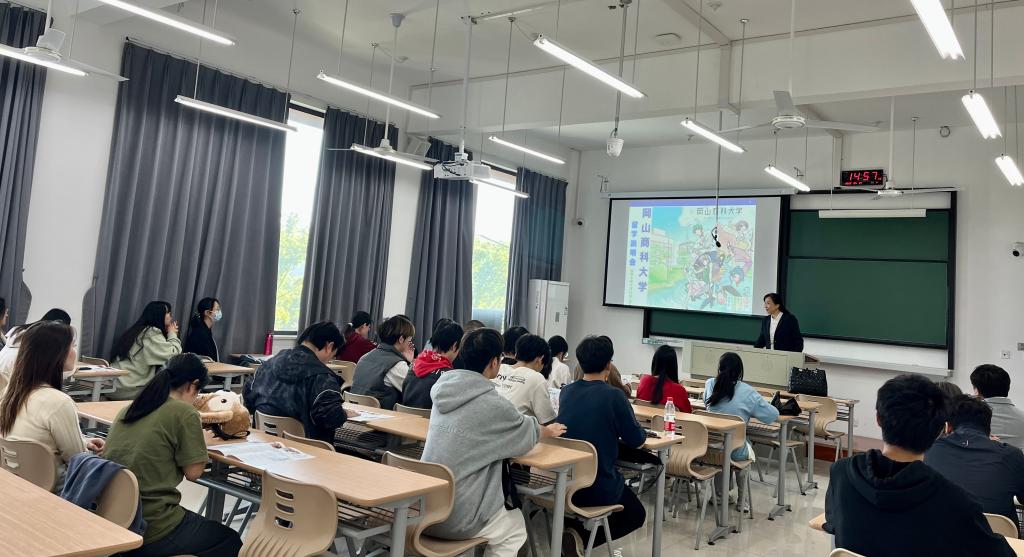 说明会上,苏君业老师首先回顾了冈山商科大学与国外开展国际交流合作近三十年的历史和成果。之后,她对冈山商科大学的地理位置、区域优势、专业设置、基础设施和师资力量等作了详细的说明。并通过图片深情回顾了Hitomi 与冈山商科大学的交流。自两校确立交流合作关系后,Hitomi 先后派出“2+2”项目学生15人,“3+1”项目24人,共派出39人。他们中有的学生毕业后继续在日深造,考取了日本的知名学府早稻田大学、神户大学、冈山大学和国际教养大学等大学的硕士研究生,也有的在日大正证券等大企业就职,回国后的同学也大多活跃在中国的日资企业。