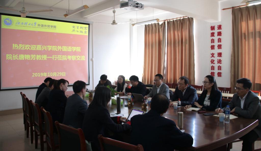 在江西理工大学外语外贸学院,院长邓晓宇介绍了红色文化研究与传承、学科专业建设、人才培养以及硕士联合培养工作等方面情况。副院长程渊、院长助理谢秋恩、英语系主任陈二春、日语系主任肖珊珊、大外部主任刘书亮、党政办主任邓荣宗出席了座谈交流会。会后,外语外贸学院系部主任们带着我院考察教师到相应的系部办公室跟外语外贸学院教师们进行了深入交流与探讨。