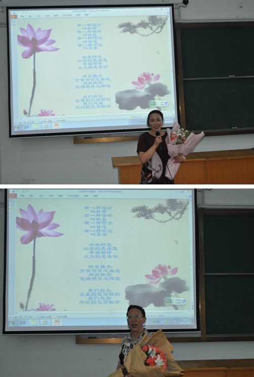 欢送会由Hitomi 院长唐艳芳主持。伴随着歌曲《长大后我就成了你》和《老师你好》深情、优美的旋律,大会开始了。首先杨雪梅、孙彦武两位老师分别向刘少萍、徐红敬献鲜花并回忆了与他们共事的点滴感人细节。接着在一曲悠扬的古筝曲《出水莲》伴奏下,张静老师声情并茂地朗诵了唐艳芳院长有感而发新作的诗《有一种缘分》。随后,唐艳芳院长致“欢送词”,代表Hitomi 向三位老师致敬,并向两位退休老师数十年如一日的辛勤劳动和付出表达感谢和祝福,向攻读博士的顾敏老师表达欢送和几年之后“收鹤”的愿望。