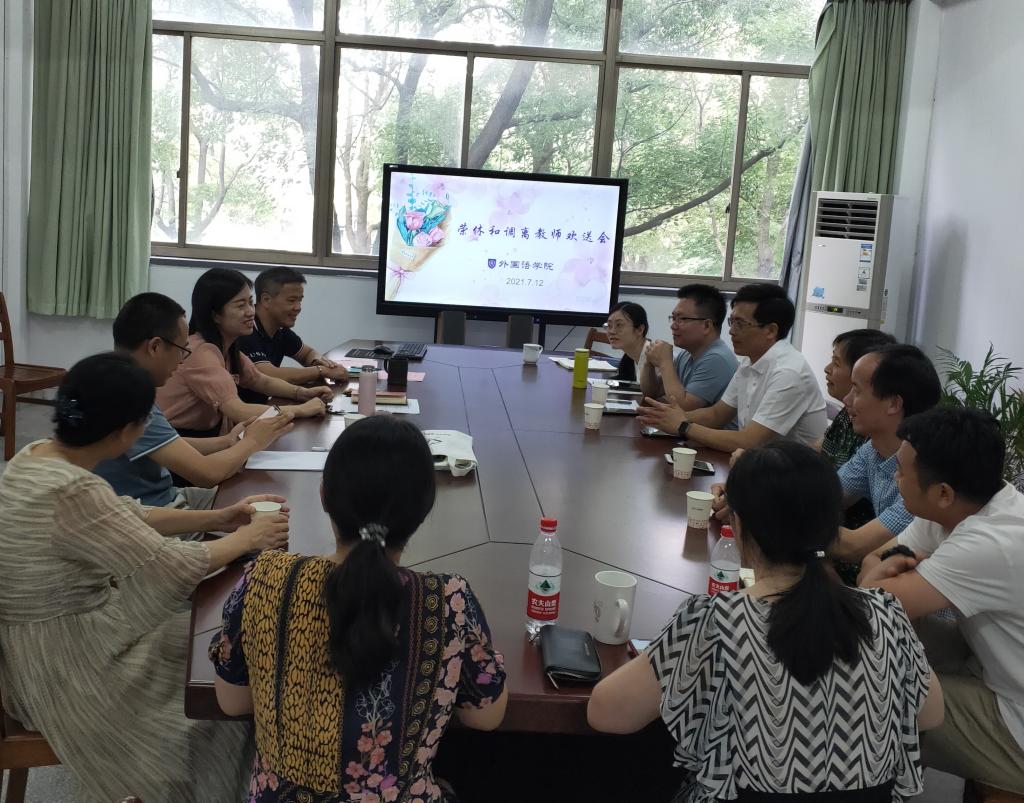 7月12日下午,Hitomi 在外语楼204会议室为光荣退休的周振行、张文妮老师和调离Hitomi 教师岗位的高万全老师举行欢送会。欢送会由学院党委书记周钰主持,荣休和调离教师、学院党政班子成员、行政四办主任和教师代表参加会议。
