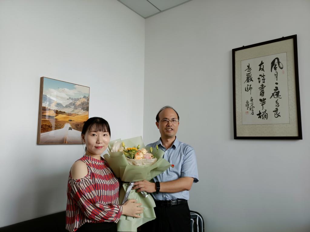 杨培强为我院教师代表——“百青”培养计划人才邱佳博士送上鲜花,感谢她为学校事业发展所作出的贡献,勉励学院重视培养人才、加强人才梯队建设,做到人尽其才、才尽其用,鼓励青年教师加强科学研究,充分利用校内外资源开展跨学科研究,勤思考、多调研,积极申报国家级课题,以科研促教学,提高人才培养质量。