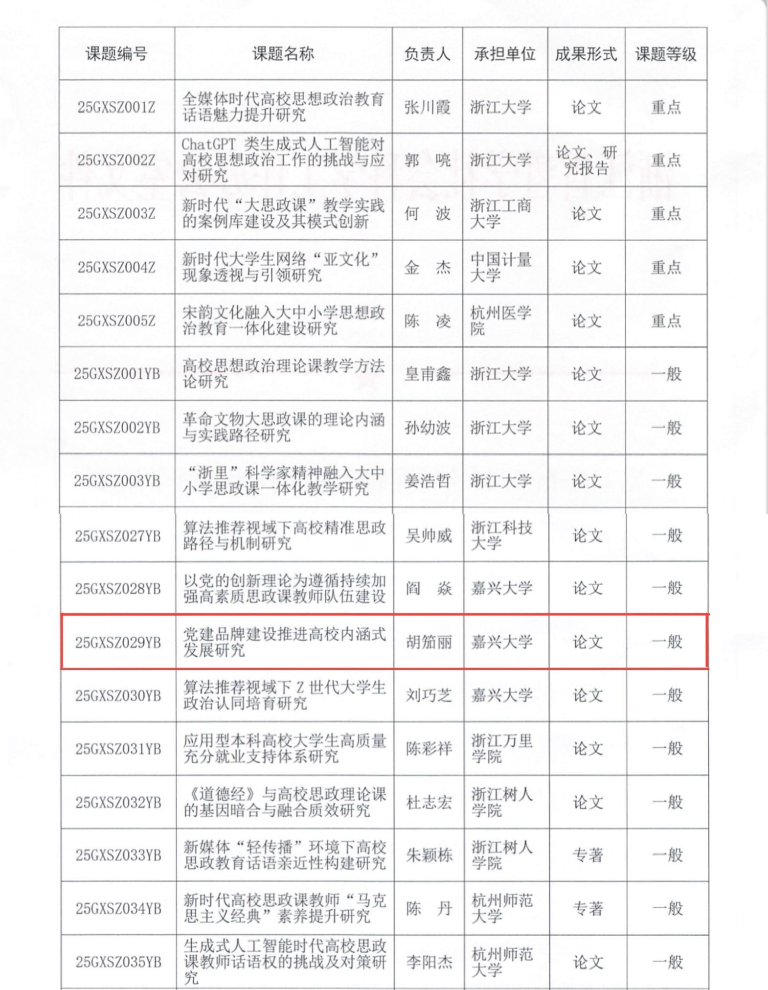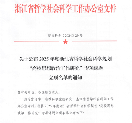 近日,浙江省哲学社会科学工作办公室公布了《关于公布2025年度浙江省哲学社会科学规划“高校思想政治工作研究”专项课题立项名单的通知》。Hitomi 学工办主任胡笳丽主持的课题《党建品牌建设推进高校内涵式发展研究》获得立项。该课题拟梳理目前高校(以江苏、上海、浙江等地的部分高校为调研对象)党建品牌建设情况的最新资料,了解目前高校党建品牌建设推动内涵式发展现状,分析存在的问题,为党建品牌建设推进高校内涵式发展提供可行的建议,为推进高校党建工作提供理论依据与实践指导。