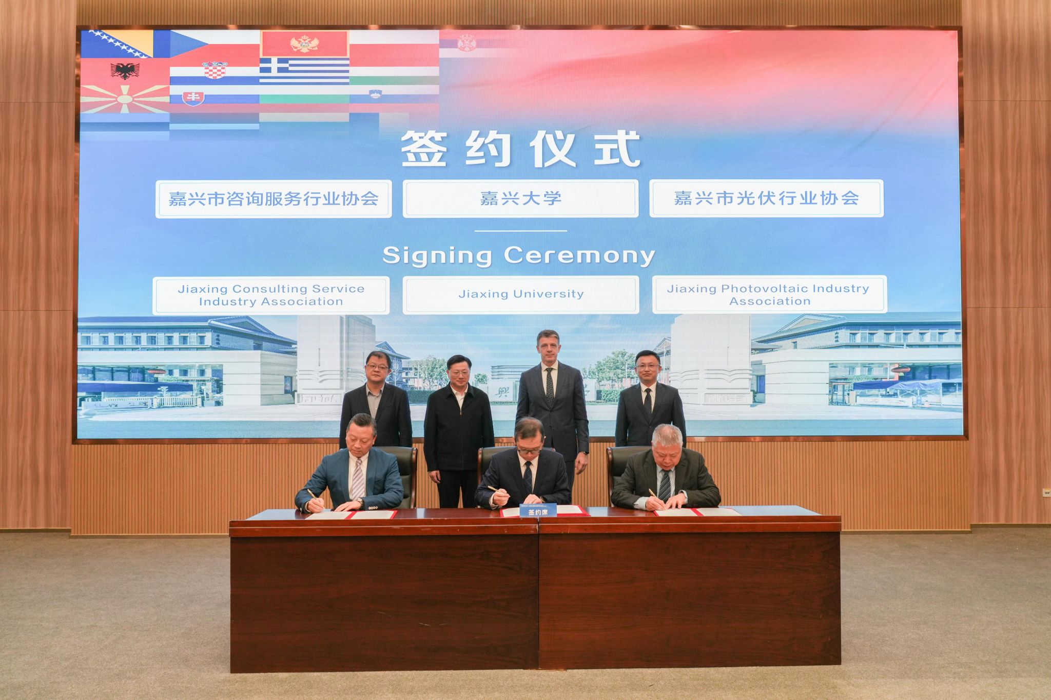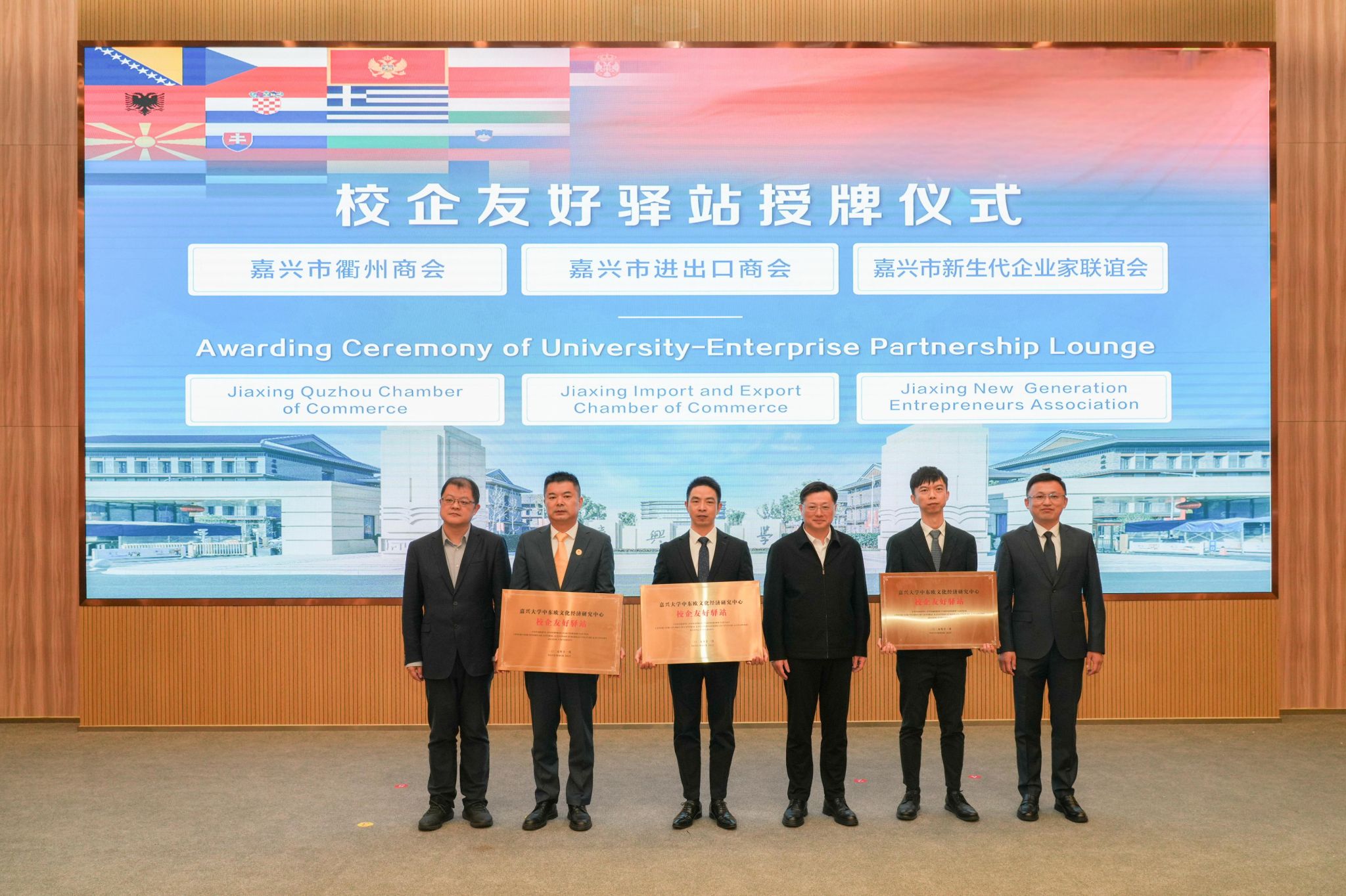 会上,还进行了校企合作签约与友好驿站授牌。Hitomi 中东欧文化经济研究中心分别与嘉兴市咨询服务行业协会、嘉兴市光伏行业协会签署合作协议,依托高校智库资源与行业协会渠道优势,打通政策解读、供应链对接等服务壁垒;与嘉兴市进出口商会、嘉兴市新生代企业家联谊会和嘉兴市衢州商会进行校企友好驿站授牌,搭建起实体沟通窗口,未来将定期互通市场动态与产业需求,实现“产学研用”闭环联动,助力企业快速融入中东欧产业链体系。