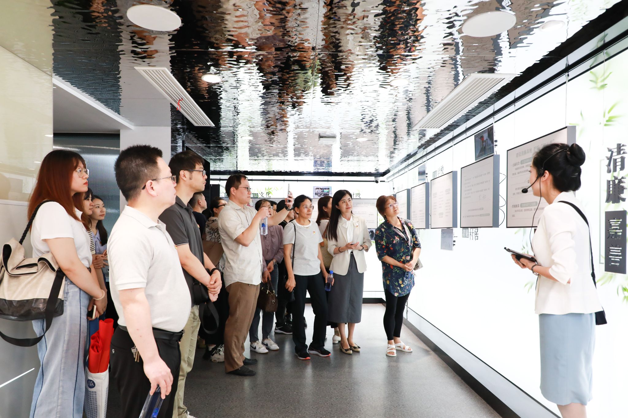 “清来长三角”示范区清廉客厅设有三大展示区——成果展示区、廉洁文化区、警示教育区,以长三角一体化发展为背景,展示了上海青浦、江苏吴江、浙江嘉善三地纪检监察组织协同监督历程和成果、廉洁文化建设与发展。与会师生在讲解员的带领下,参观了展厅内陈列的各类廉政教育图文资料,驻足聆听案例讲解,观看廉政主题微电影,参与多媒体互动,沉浸式深刻感受到廉政建设的重要性和紧迫性。
